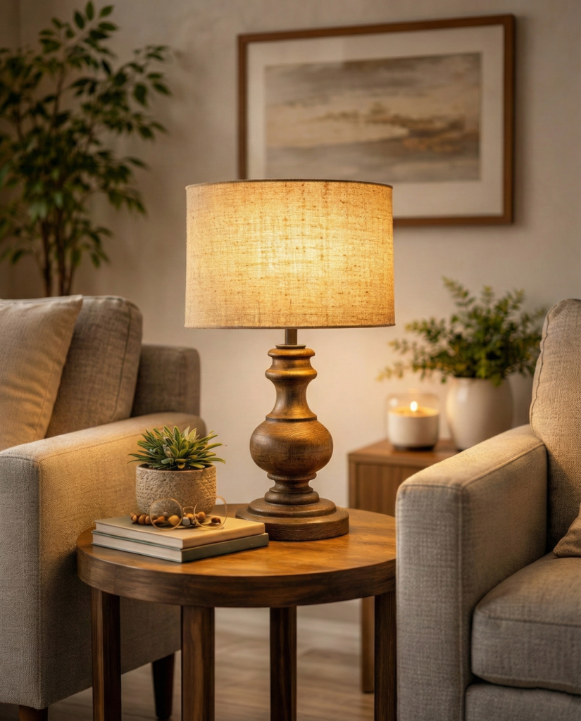 Bu şık masa lambasını oturma odanızdaki yan sehpaların üzerinde, çalışma masanızda veya yatak odası komodinlerinde kullanarak huzurlu bir aydınlatma köşesi oluşturabilirsiniz. Ahşabın doğal ve sıcak tonlarını, krem rengi şapkasıyla kombinleyerek göz yormayan, yumuşak bir ışık ambiyansı elde edebilirsiniz.